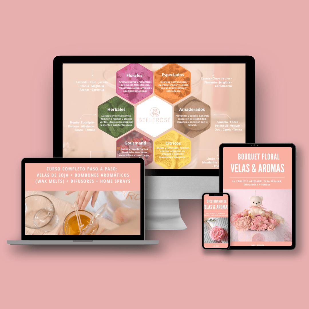 Incluye el paso a paso para velas de soja y aromatizantes (difusores, room spray, bombones aromáticos y velas de molde), con principal foco en materiales, proceso, aroma y precio para que no estés adivinando.